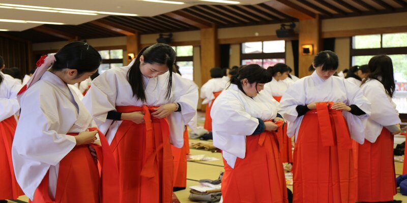 Để gồm thể đảm nhận mục đích này, một số nhân viên cấp dưới mặt đất của JAL Fukuoka đã trải qua khóa huấn luyện tại đền thờ Munakata Taisha, nằm ở thị trấn Munakata, tỉnh Fukuoka. Mặc dù làm cho việc như một vu nữ trong đền thờ không yêu cầu phải tuyên thệ thọ dài, nhưng công việc này vẫn đòi hỏi rất nhiều kiến thức. Họ cần biết nhảy múa các điệu nhảy truyền thống, quét dọn Thần điện, góp việc bái bái, đảm nhận phương châm trang điểm cô dâu,…